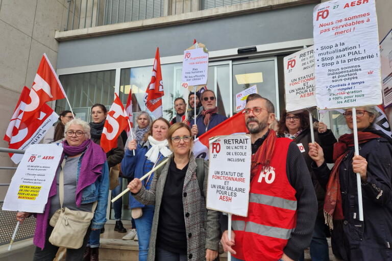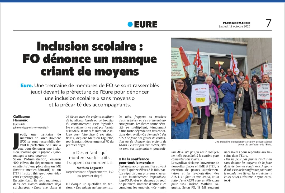 Le jeudi 16 octobre, le SNUDI FO 27 avait appelé à un rassemblement devant la Préfecture pour dénoncer l’inclusion scolaire systématique et forcée qui maltraite les enseignants, les AESH, les élèves, les parents, … dans les écoles de l’Eure.